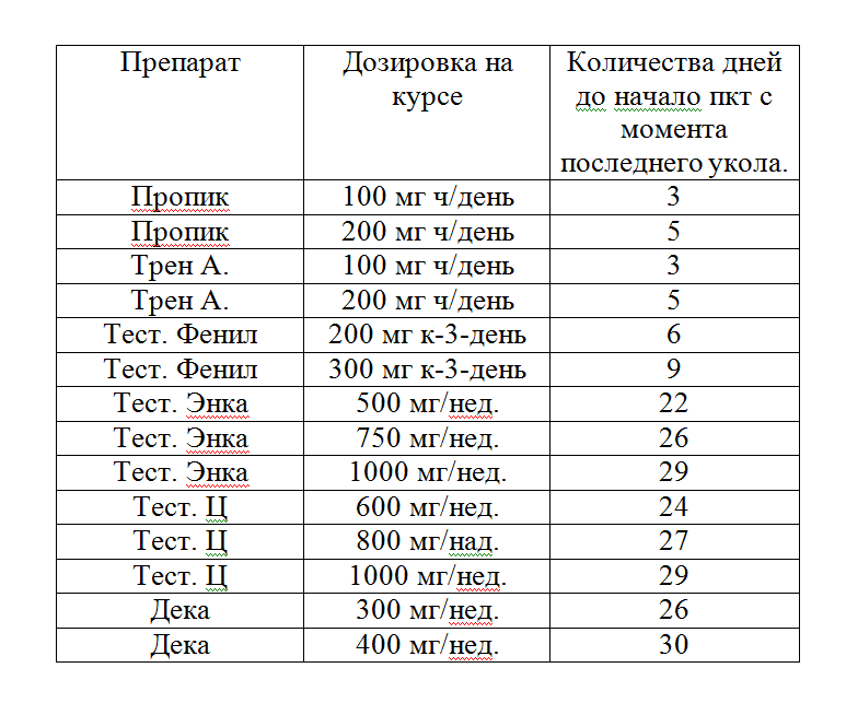Далее будет указана таблица для самых популярных препаратов и дозировок с указанием дней до начало ПКТ с момента крайнего укола