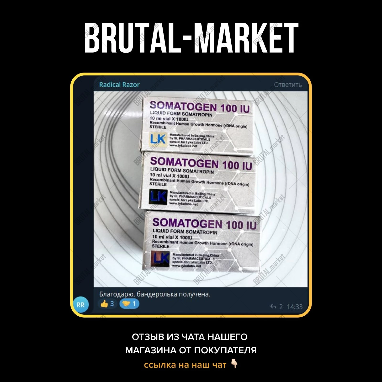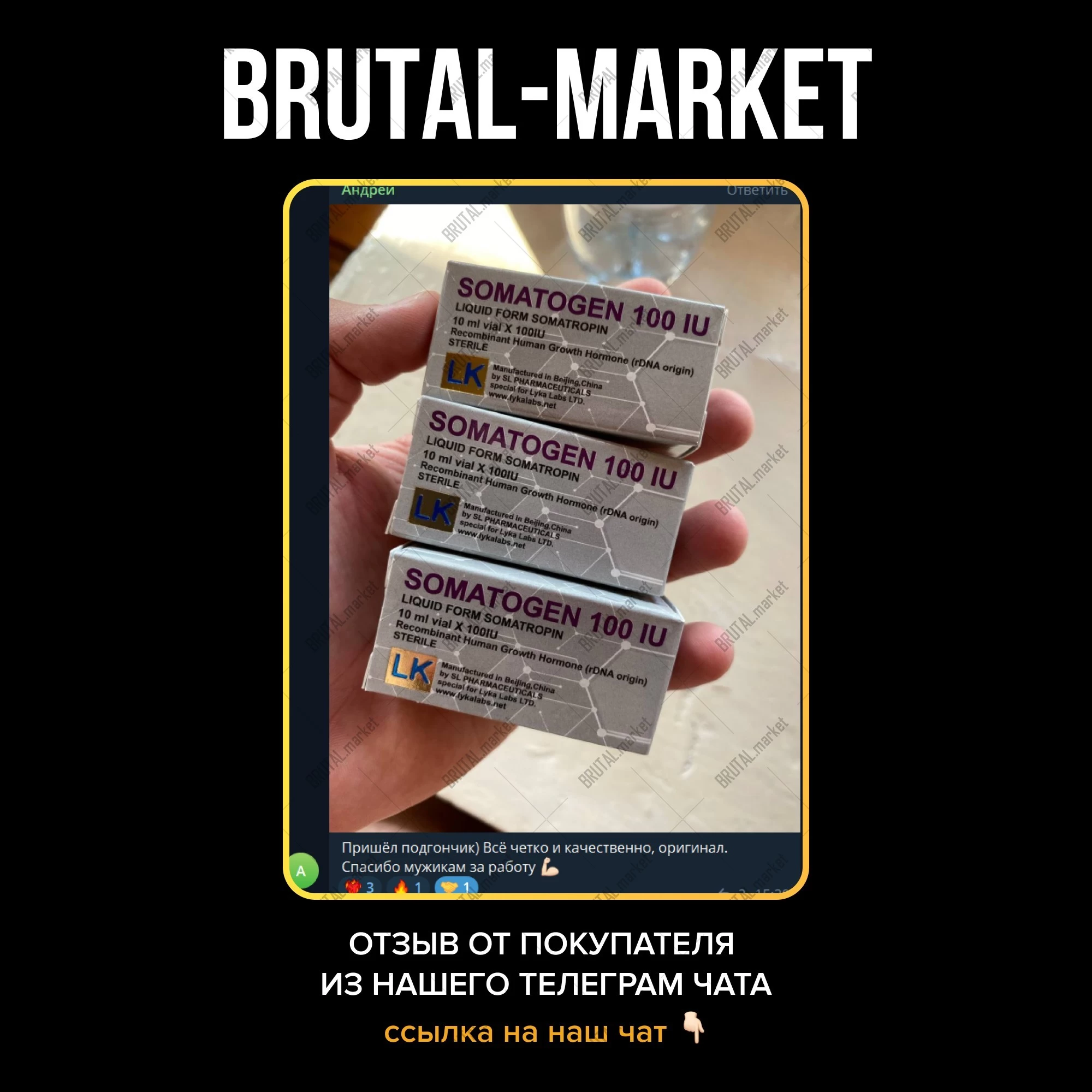 Просматривая каталог интернет-магазина Брутал Маркет, предлагаем вам обратить внимание на высокое качество препаратов, а также на их широкий ассортимент. В частности, на нашем сайте вы имеете возможность заказать востребованный спортсменами гормон роста, который применяется в качестве анаболического средства, хорошо сочетается с Надролоном Деканоат.